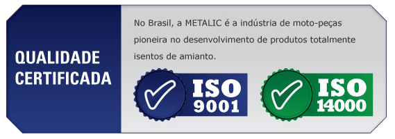 METALIC BRAKE SYSTEM é uma marca reconhecida no mercado de moto-peças desde 1985. Desenvolve componentes de freios para motocicletas nacionais e importadas. Busca continuamente oferecer o que há de melhor em inovação tecnológica. Esse constante processo de aperfeiçoamento possibilitou à METALIC obter o certificado ISO 9001.